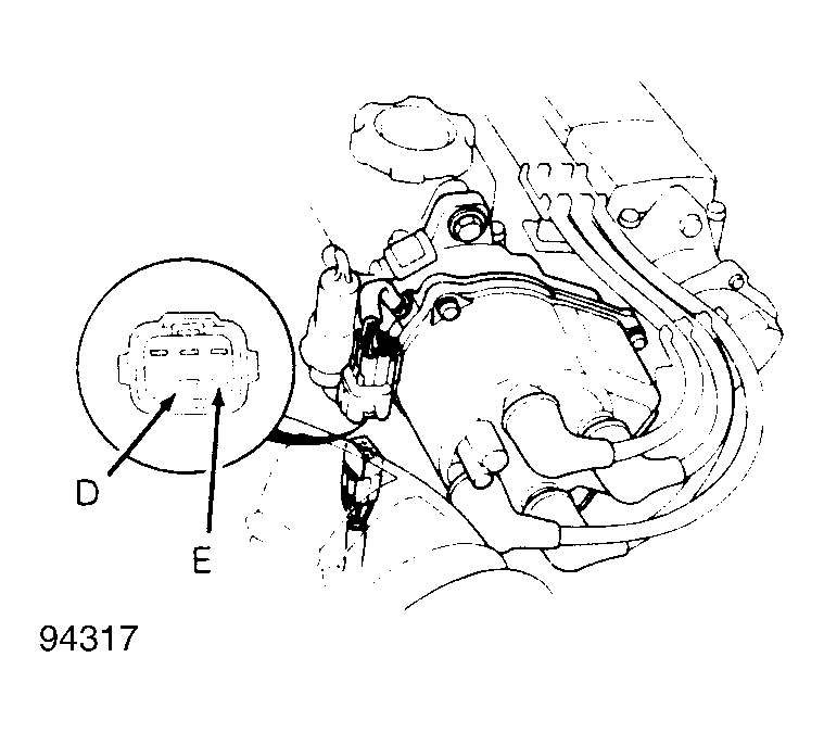 . If resistance is not 350-550 ohms, replace distributor assembly. If resistance is within specification, check for continuity between ground and terminals "D" and "E". If continuity exists, sensor is shorted to ground. Replace distributor assembly.