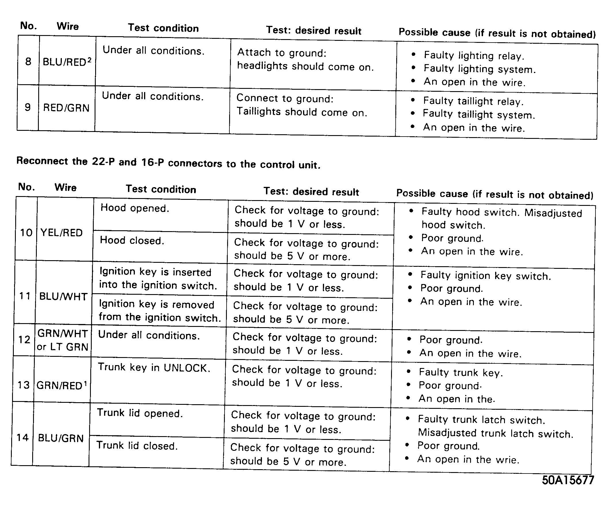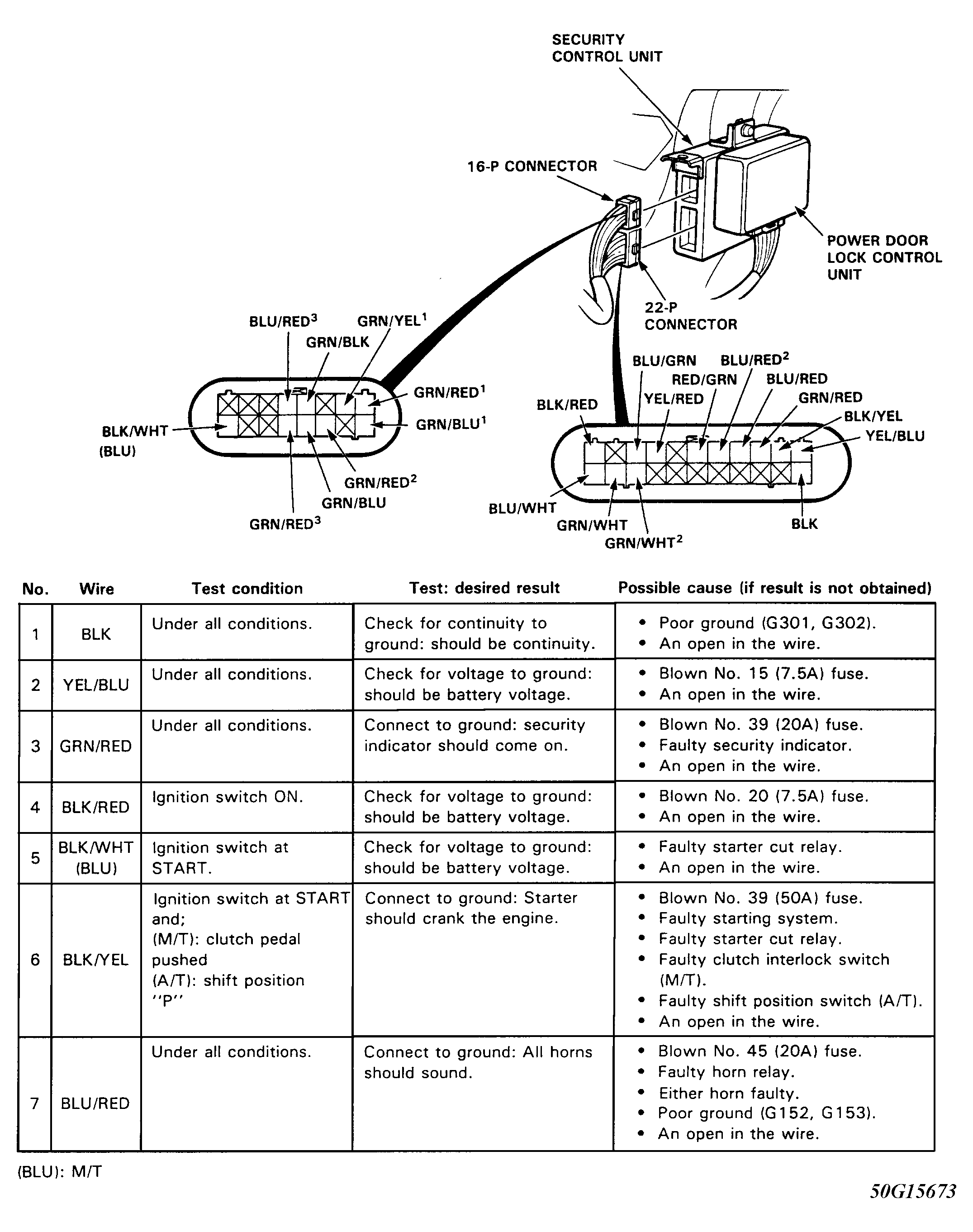 Remove driver's side instrument panel lower cover. Disconnect security system control module 16-pin and 22-pin connectors. Inspect connectors to ensure terminals are making good contact. If terminals are bent, loose or corroded, repair as necessary and recheck system. If terminals are okay, use a Digital Volt/Ohmmeter to perform this test. See Fig 1 -Fig 5 . If input test is okay, replace control module.