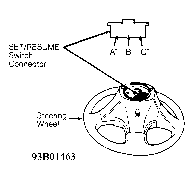 1. Remove steering wheel. Disconnect SET/RESUME switch 3-pin connector from cable reel. Using a DVOM, check for continuity between SET/RESUME switch 3-pin connector terminals "A" and "C" with SET pressed. See Fig 1 . Continuity should be present. If continuity is present, go to next step. If continuity is not present, replace SET/RESUME switch. See SET/RESUME SWITCH under REMOVAL & INSTALLATION  .