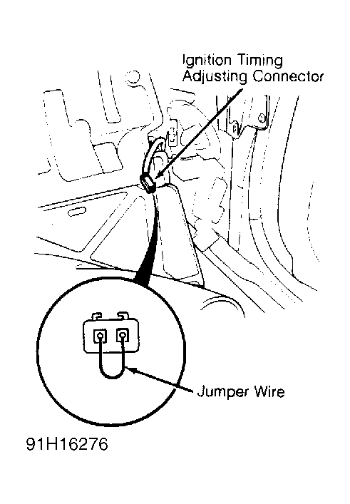 1. Operate engine until cooling fan comes on. Locate under right side of dash. Connect terminals of ignition timing adjusting connector with a jumper wire. See Fig 1 .