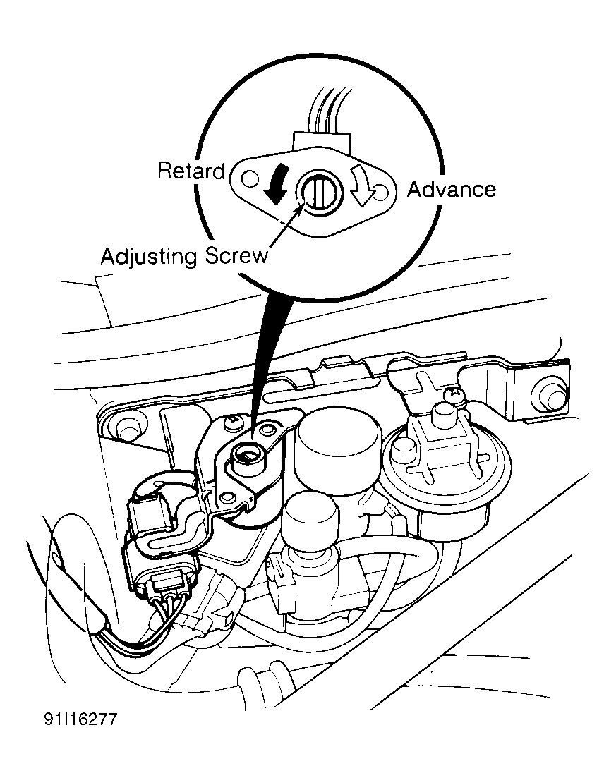 4. Turn adjusting screw counterclockwise to retard timing or clockwise to advance timing. After adjustment, install cover to ignition timing adjuster with new rivets. Remove jumper wire from ignition timing adjusting connector.