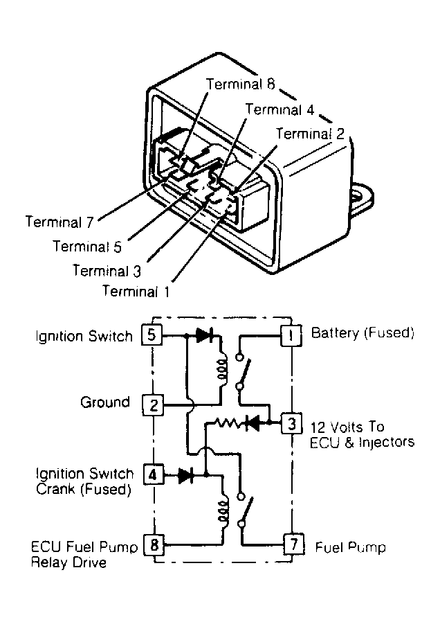 - Connect battery positive terminal to relay terminal No. 3. Connect battery negative terminal to relay terminal No. 8. Check for continuity between relay terminals No. 5 and 7. If continuity exists, relay is okay. If continuity does not exist, replace relay.