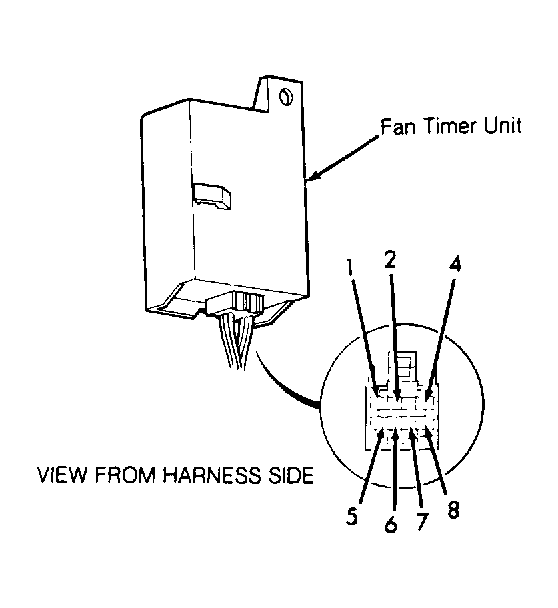 - Locate condenser fan timer unit under center of dashboard, but DO NOT disconnect harness connector. Turn ignition on. Using a DVOM, check for voltage between terminal No. 4 (Black wire) and chassis ground. See Fig 1 .