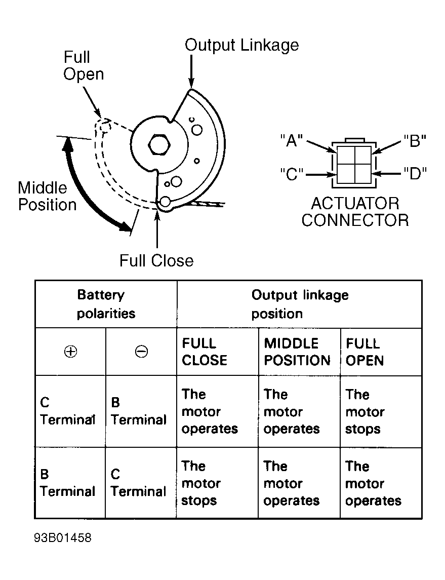 - Disconnect 4-pin connector at actuator. Actuator is located on left side of engine compartment. Using jumper wires, connect battery voltage to terminal "D" of actuator connector and terminal "A" of actuator connector to ground. See Fig 1