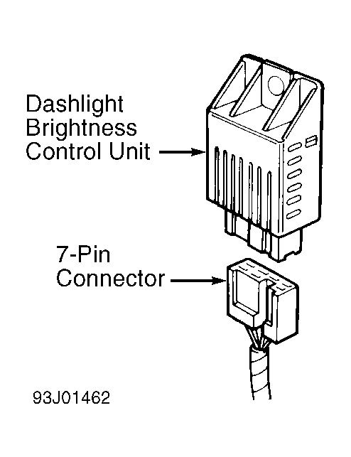 - Access dashlight brightness control unit located behind left side of radio. Disconnect dashlight brightness control unit 7-pin connector. See Fig 2