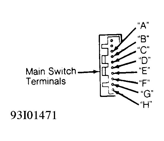 - Ensure main switch is off. Using a DVOM, check for continuity between main switch terminals "G" and "H" and "D" and "E". See Fig 1