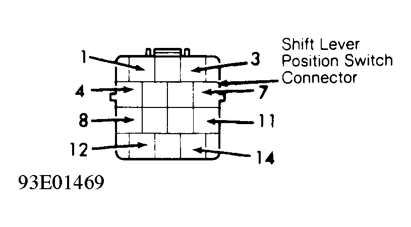- Using a DVOM, check for continuity between shift lever position switch 14-pin connector terminal No. 11 and ground with shift lever in "2", "D" and "D4" positions. See Fig 1
