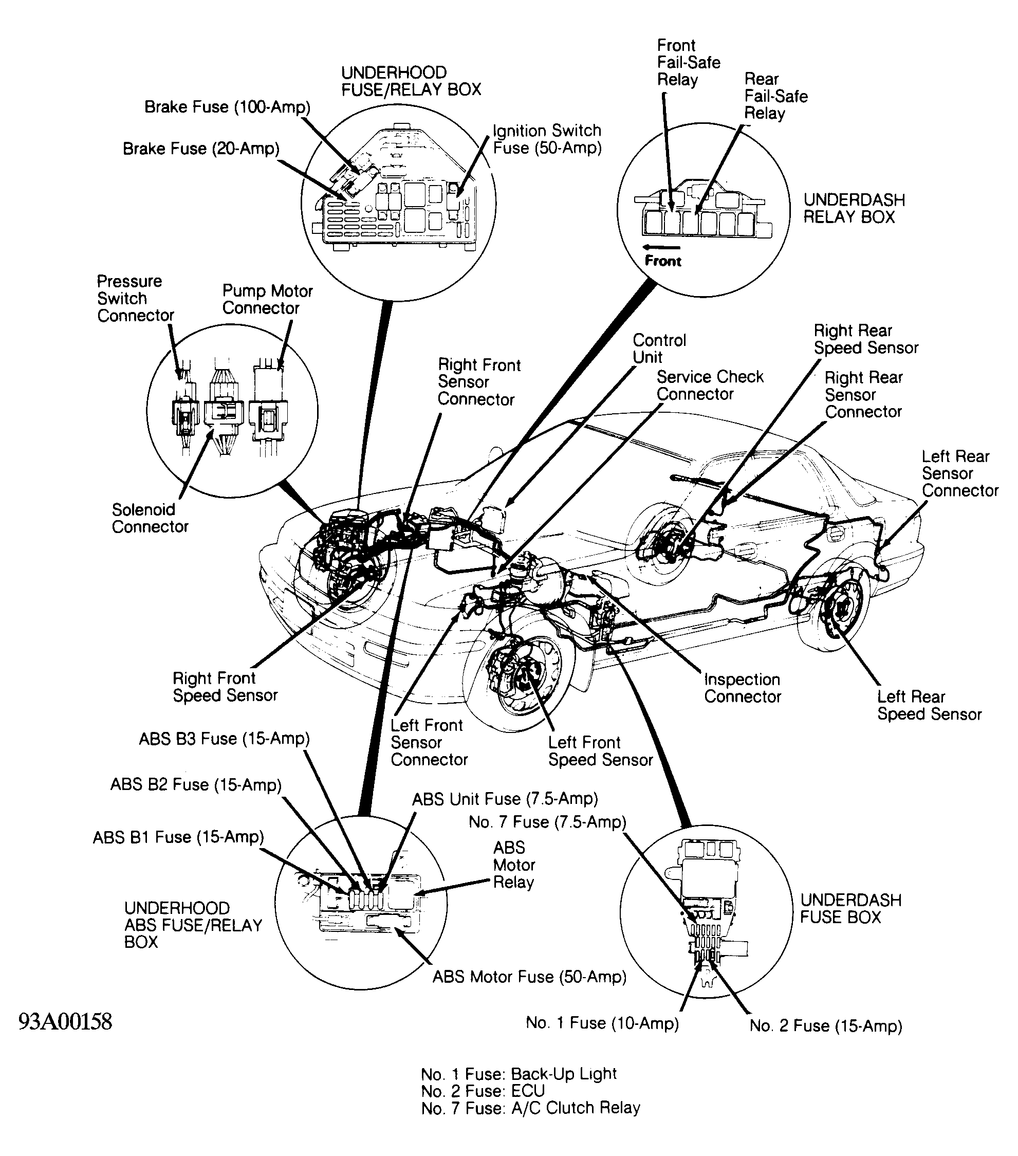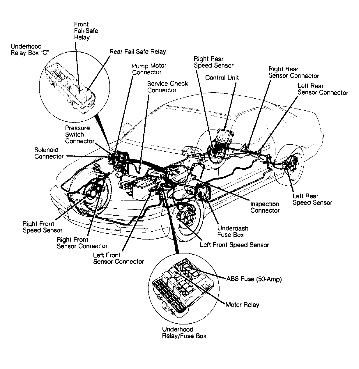 The Anti-Lock Brake System (ABS) is designed to prevent wheel lock-up during hard braking. This effect allows driver to maintain control of vehicle. System consists of control unit, accumulator, power unit, 4 wheel sensors, 4 gear pulsers, modulator, warning light, master cylinder, power booster assembly and connecting wiring. See Fig 1 , Fig 2 or Fig 3 .