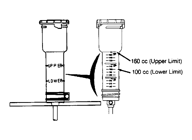 . Replace accumulator if fluid quantity in graduated reservoir is more than 160 cc. If fluid quantity is less than 100 cc, check for modulator inlet solenoid leak and accumulator leak. If fluid level rises, replace modulator.