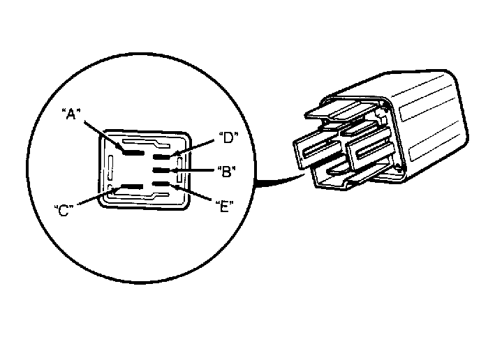Remove radiator fan main relay. Relay is located in underhood relay box "A". See Fig 2 . Continuity should exist between terminals "A" and "C" with battery voltage applied between terminals "D" and "E". See Fig 5 . With battery voltage disconnected, continuity should exist between terminals "B" and "C". If relay does not operate as specified, replace relay.