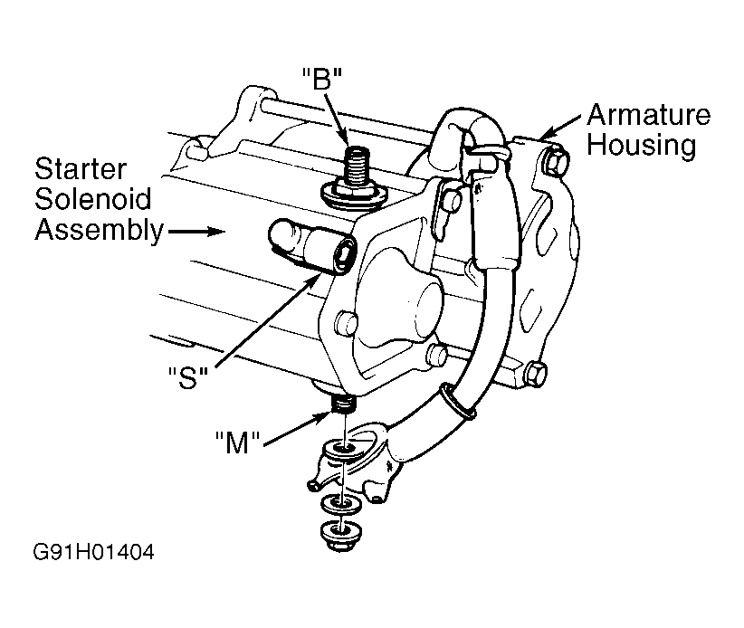 Check starter solenoid for continuity between terminal "S" and armature housing (ground). See Fig 1. Check continuity between terminals "S" and "M". Continuity should be present. If continuity is not present, replace solenoid.