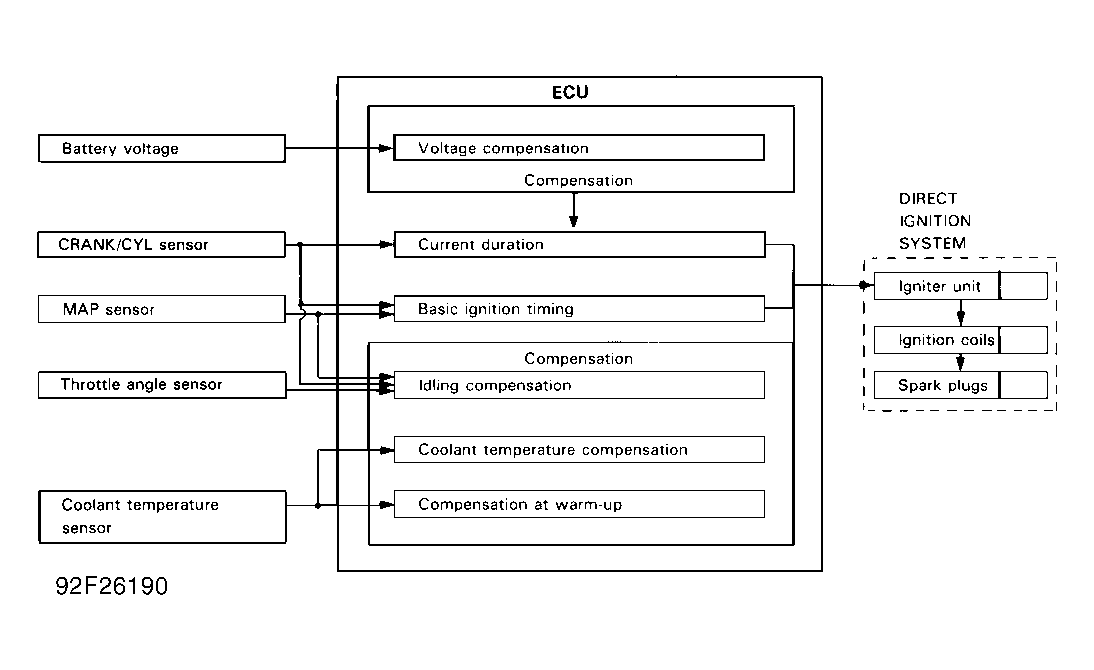 Battery voltage is supplied through ignition switch to the ECU, ignitor unit, ignition coil and spark plugs. See Fig 1 . ECU triggers ignitor unit based upon signals from CRANK/CYL and other sensors. Each spark plug is fired directly by one of 6 coils. Each coil is controlled by the ignitor.