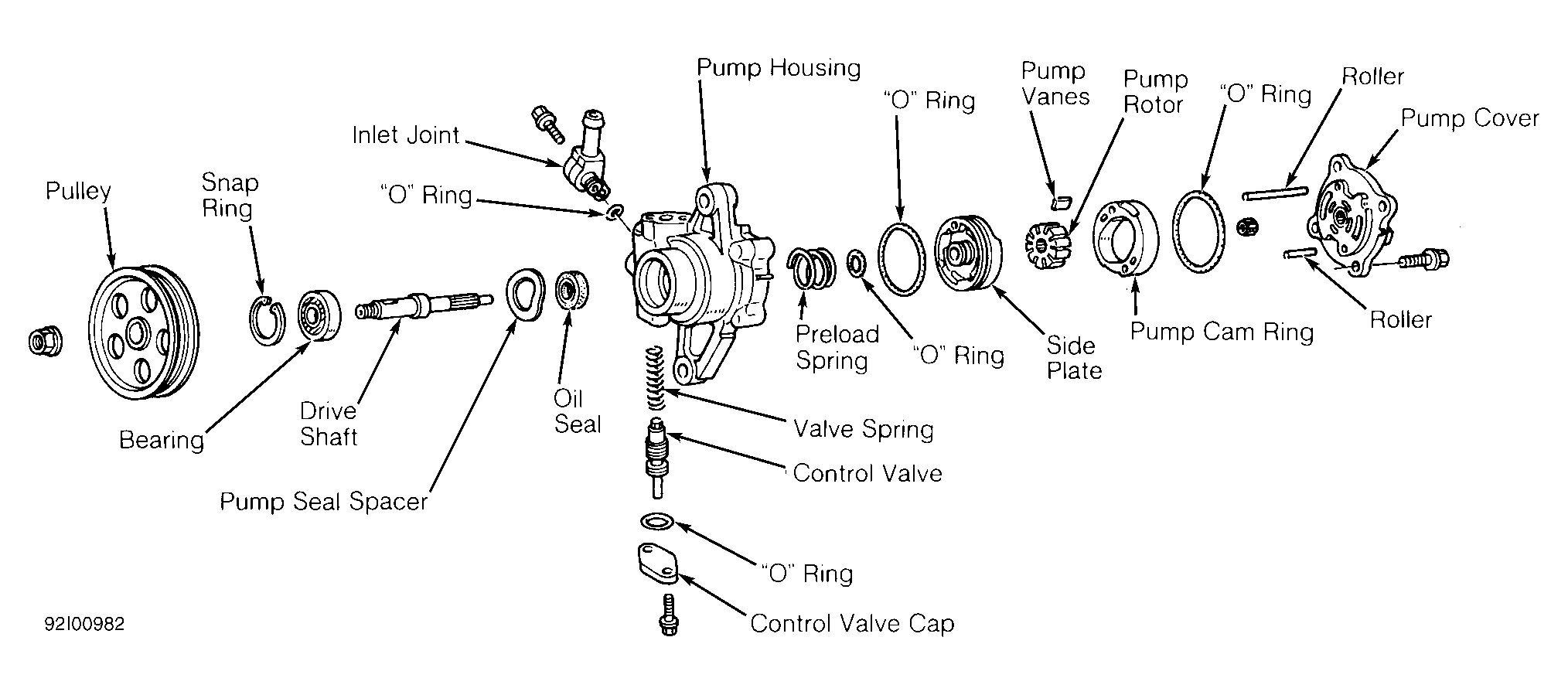 - Install drive shaft snap ring. Oil and install new "O" rings on side plate. Install preload spring in pump housing. Install one roller into hole in pump housing. Align hole in side plate with roller, and install side plate. See Fig 1. Install remaining roller in side plate.