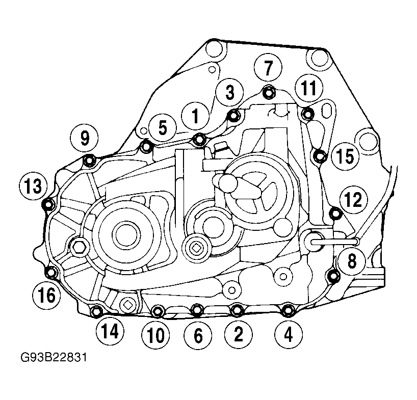 - Place transmission hanger between bolts No. 11 and 15. Tighten transmission housing bolts to 21 ft. lbs. (28 N.m) in sequence. See Fig 1 .