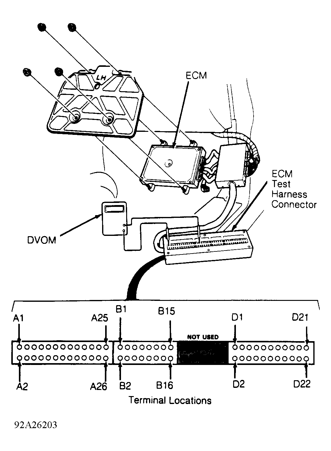 3. Turn ignition on. Measure voltage between test terminals D11 (+) and D22 (-). Voltage should be about 0.5 volt at closed throttle and about 4.5 volts at wide open throttle. Transition between lower and upper voltage specifications, as throttle is depressed, should be smooth. If voltage is correct, substitute a known good ECU. If symptom/condition goes away, replace original ECU.