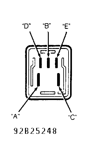 2. Using fused jumper wires, connect 12-volt battery power and ground to terminals "D" and "E". Check for continuity between relay terminals "B" and "C." Continuity should not exist. Check for continuity between relay terminals "A" and "C." Continuity should exist. Replace relay if continuity is not as specified.