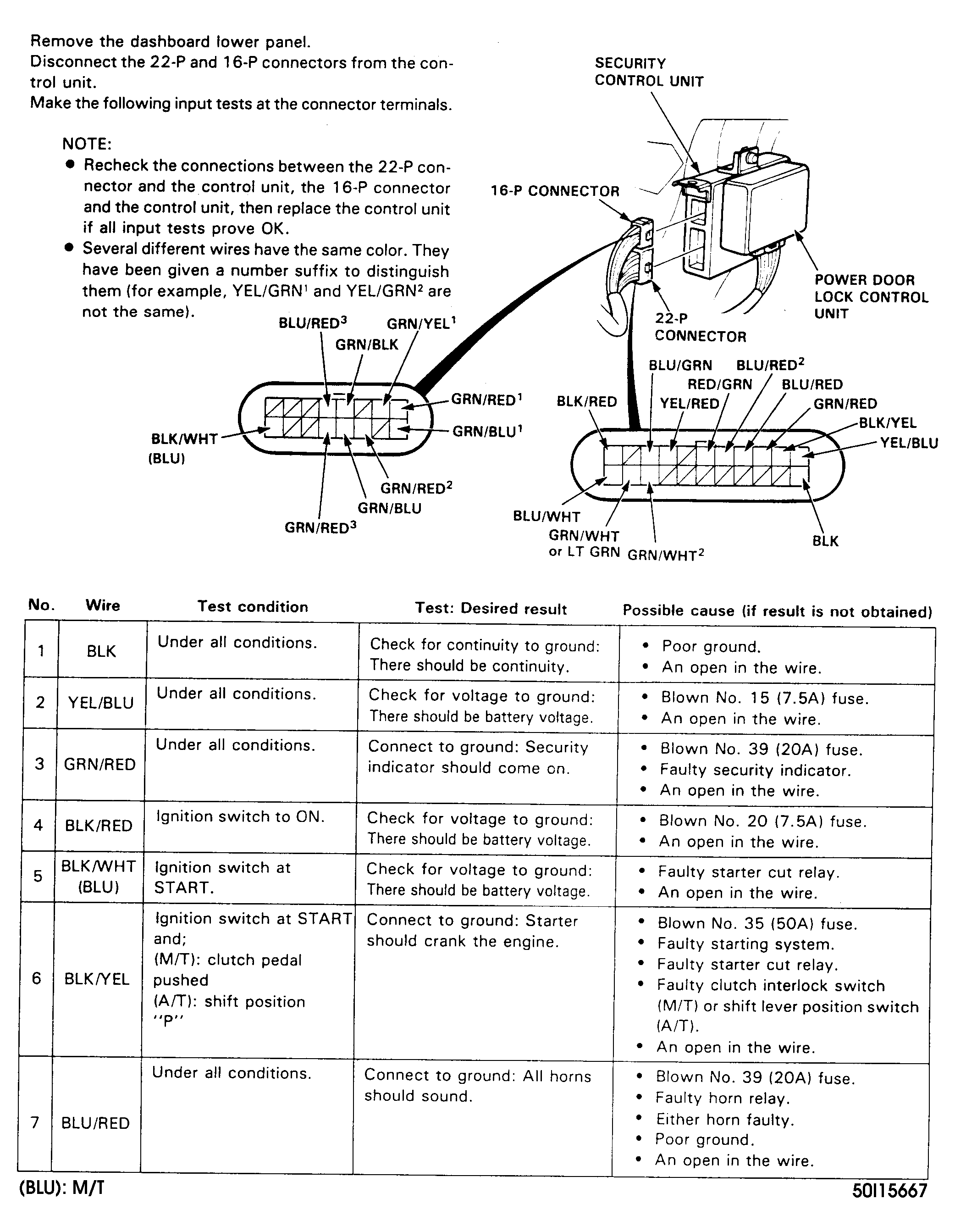 Remove driver's side instrument panel lower cover. Disconnect security system control module 16-pin and 22-pin connectors. Inspect connectors to ensure terminals are making good contact. If terminals are bent, loose or corroded, repair as necessary and recheck system. If terminals are okay, use a Digital Volt/Ohmmeter to perform SECURITY CONTROL MODULE INPUT TEST . See Fig 1 -Fig 6 . If input test is okay, replace control module.