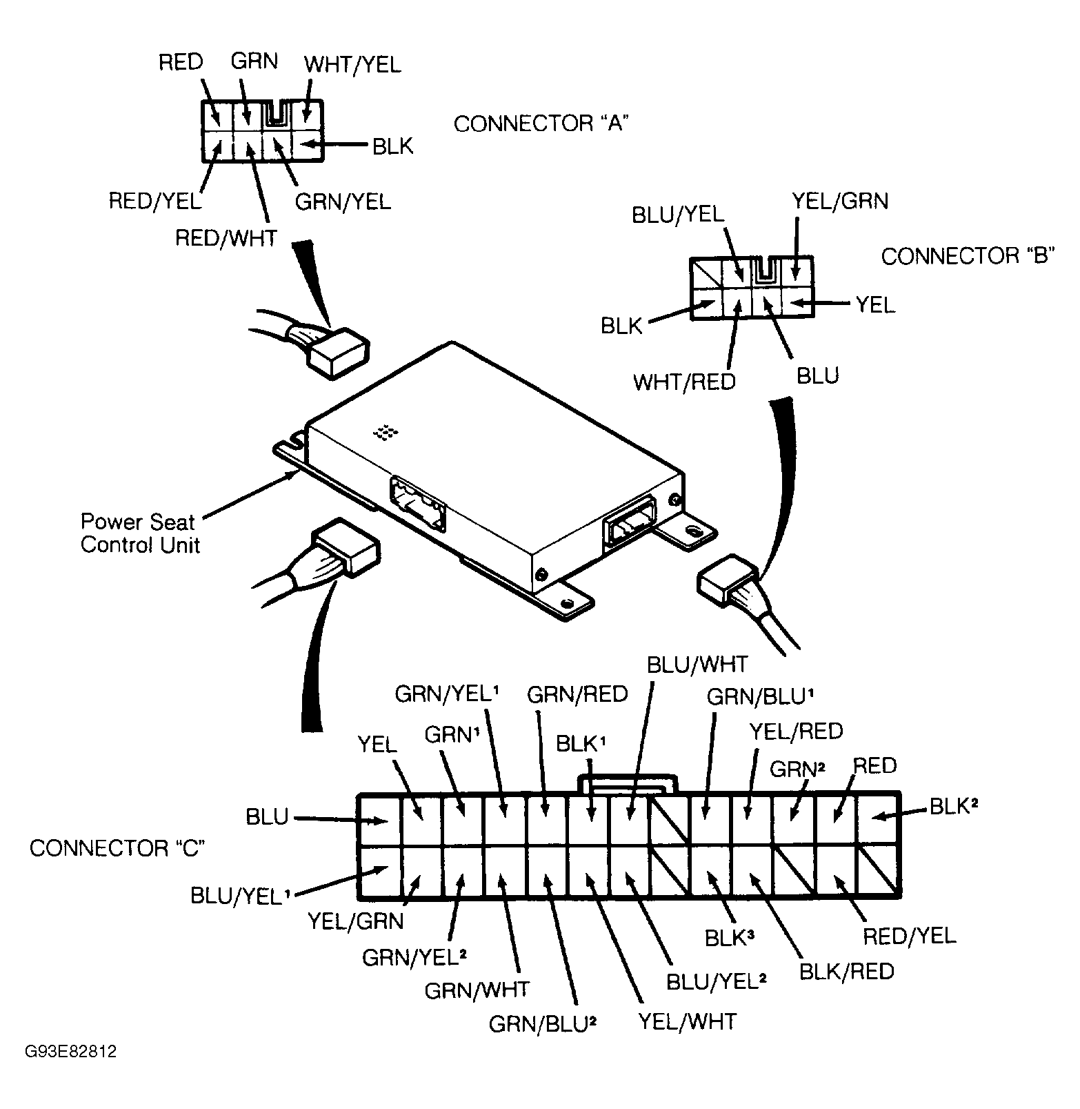 Control unit is located under front center of driver's seat. Unplug connectors. Check all connections and repair as necessary. Different wires of the same color have been assigned a superscript number to distinguish them. For example, the Green/Blue (1) wire is not the same as the Green/Blue (2) wire. See Fig 1 .