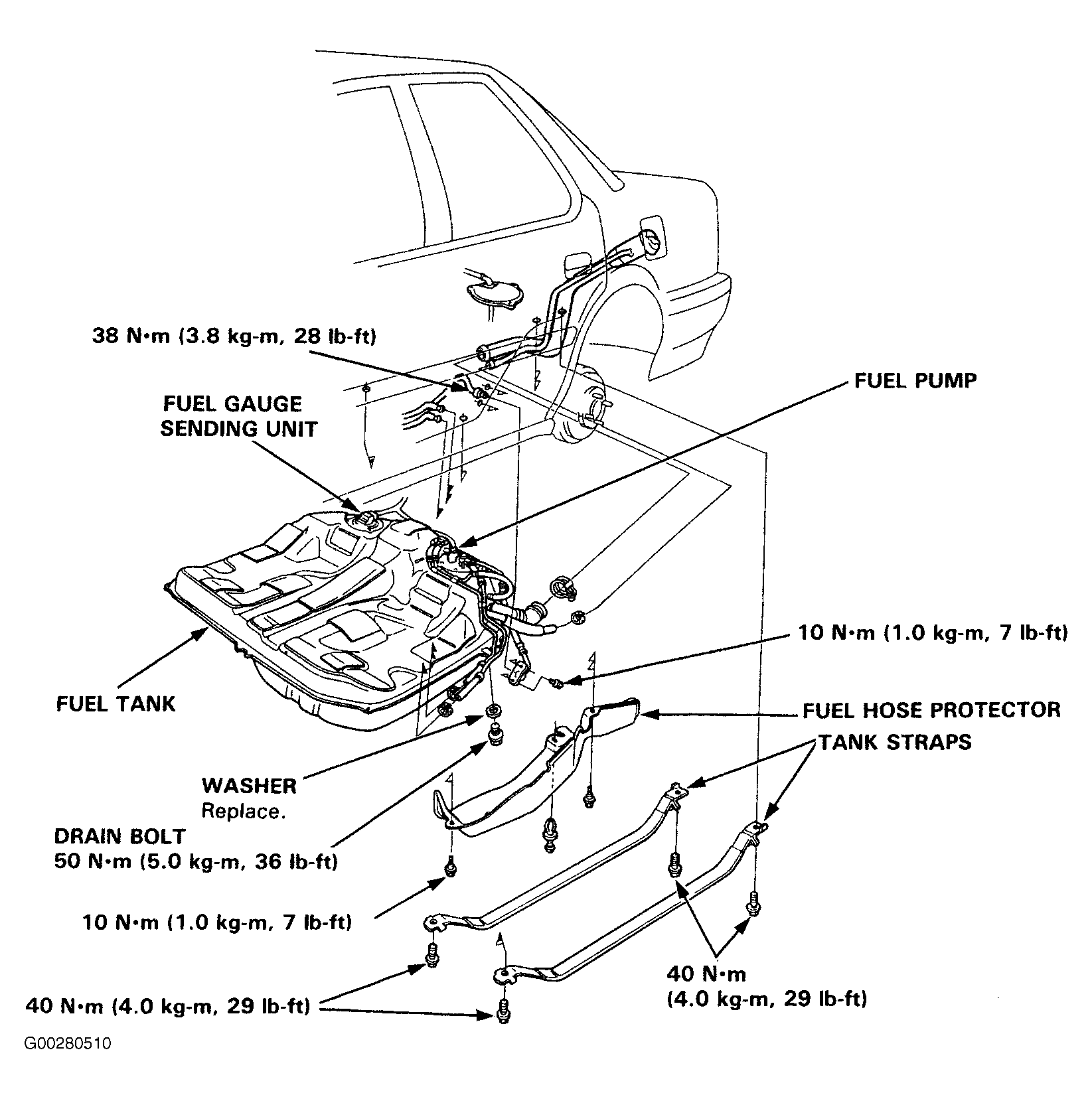 1. Raise the car. Remove the drain bolt and drain the fuel into an approved container. See Fig 1. Disconnect the 4-pin connector located under the trunk floor. Remove the fuel hose protector. Disconnect the hoses. Place a jack or other support under the fuel tank. Remove the tank strap bolts and let the straps fall free. Remove the fuel tank. If the tank sticks, carefully pry it off the mount.
