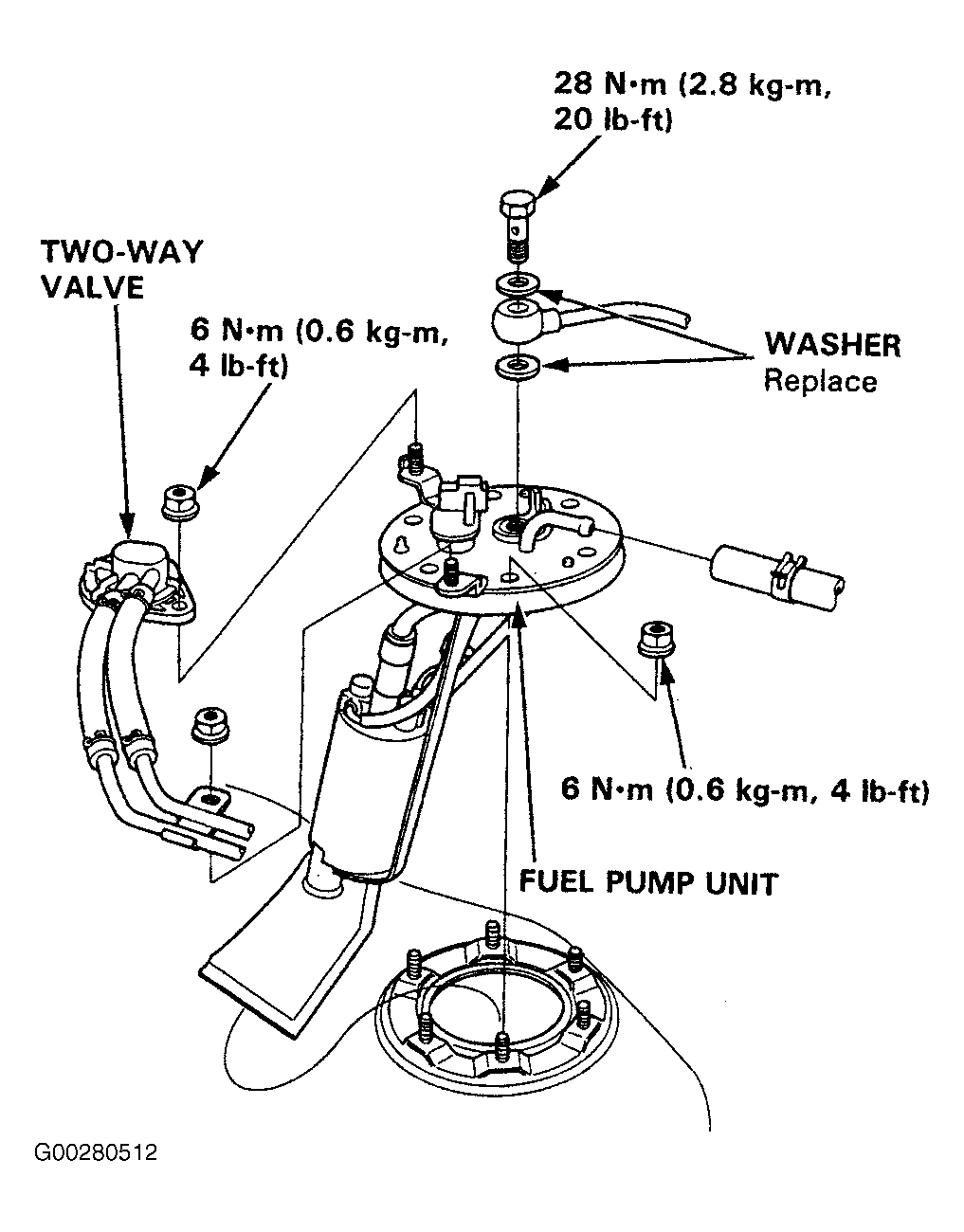 3. Install a new washer on the drain bolt and the fuel pump line. For installation, reverse removal procedure.