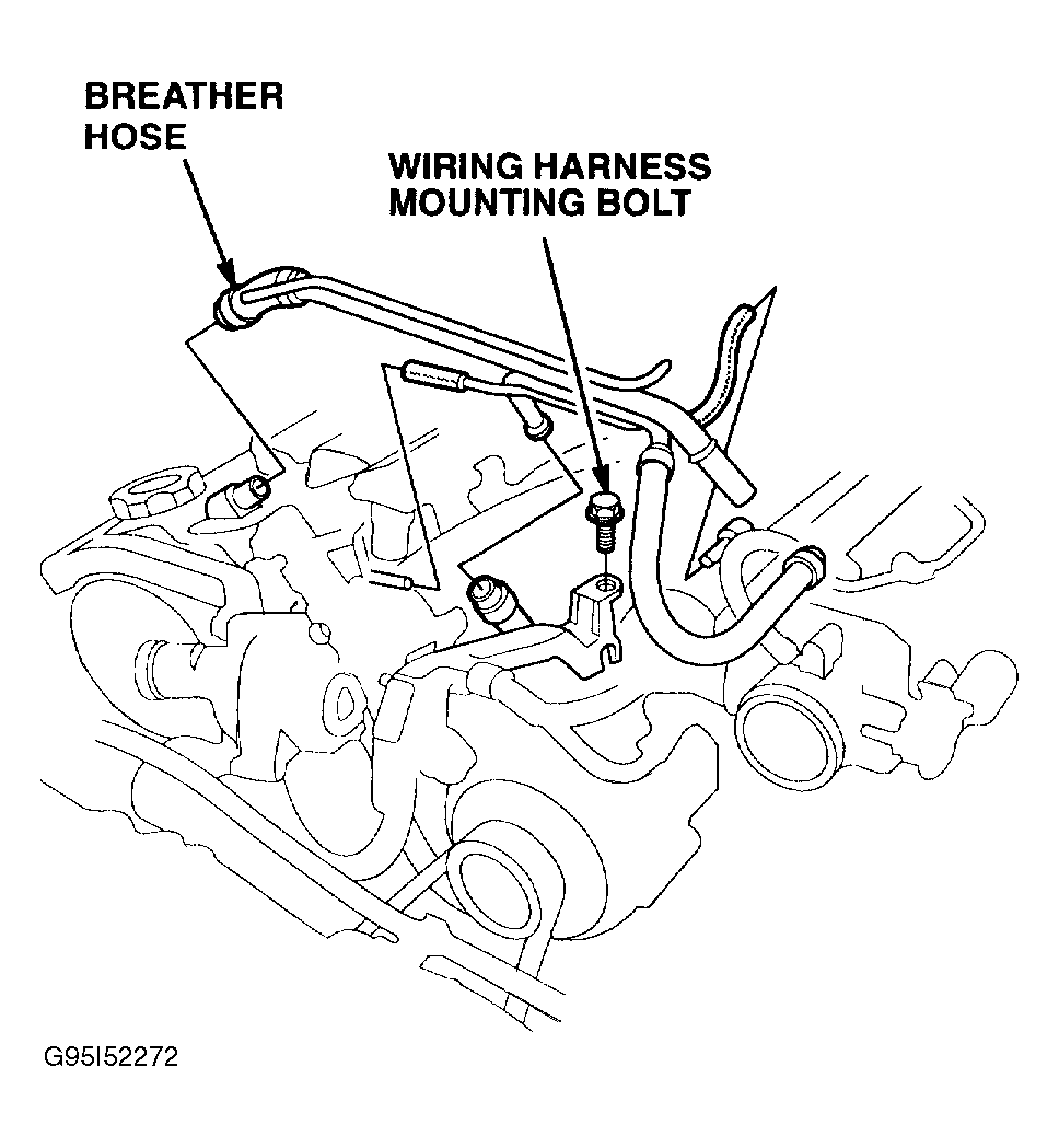 3. Remove the breather hose. Remove the wiring harness mounting bolt. Move the wiring harness out of the way. See Fig 1