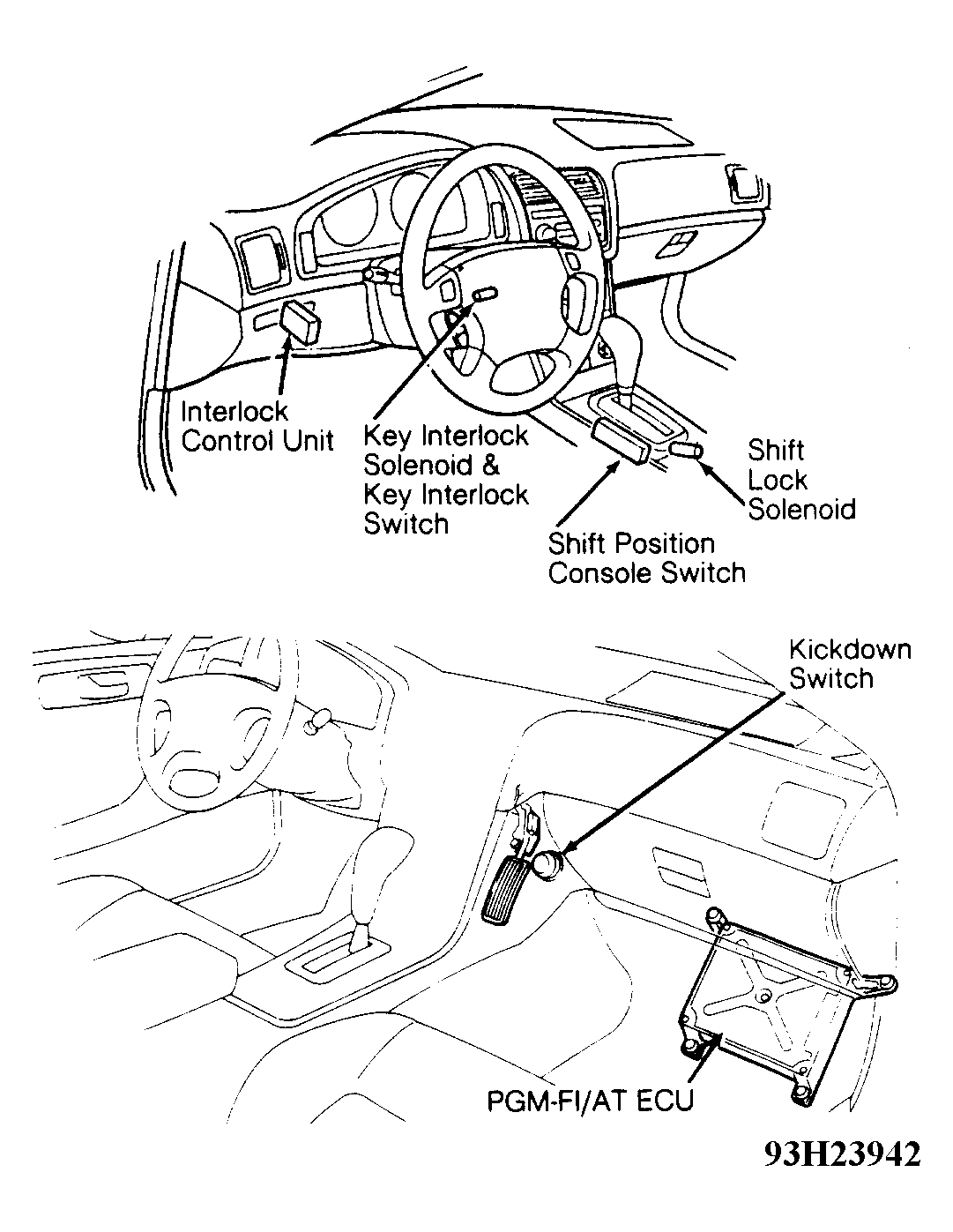 /White wire between interlock control unit and shift position console switch. Shift position console switch is mounted on driver's side of shift lever. See Figure