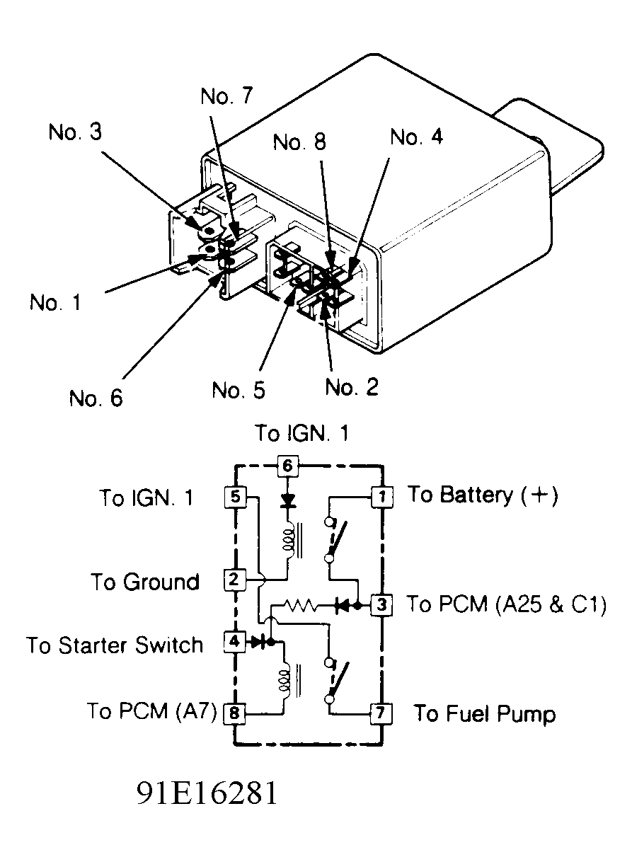 1. Remove fuel pump main relay located at left side of cowl. Connect battery voltage to terminal No. 4, and ground terminal No. 8 of relay. See Fig 1 .