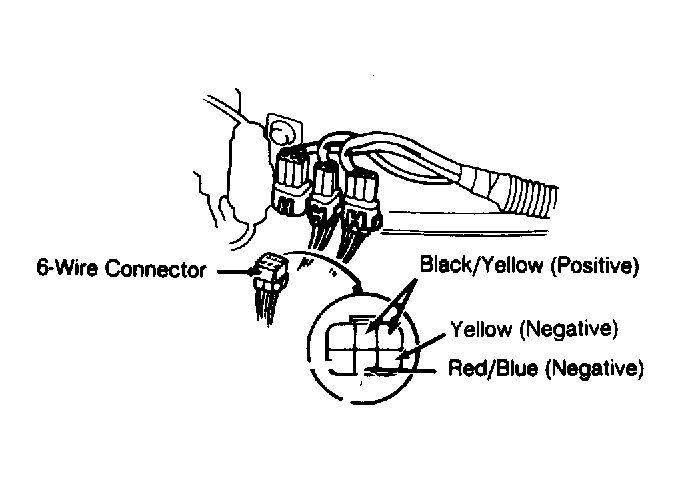 - Turn ignition off. Unplug 6-wire connector from by-pass high control solenoid. Turn ignition on. Measure voltage between Black/Yellow (positive) and Red/Blue (negative) wire terminals. If battery voltage is present, replace by-pass high control solenoid valve. If voltage is not present, go to next step.
