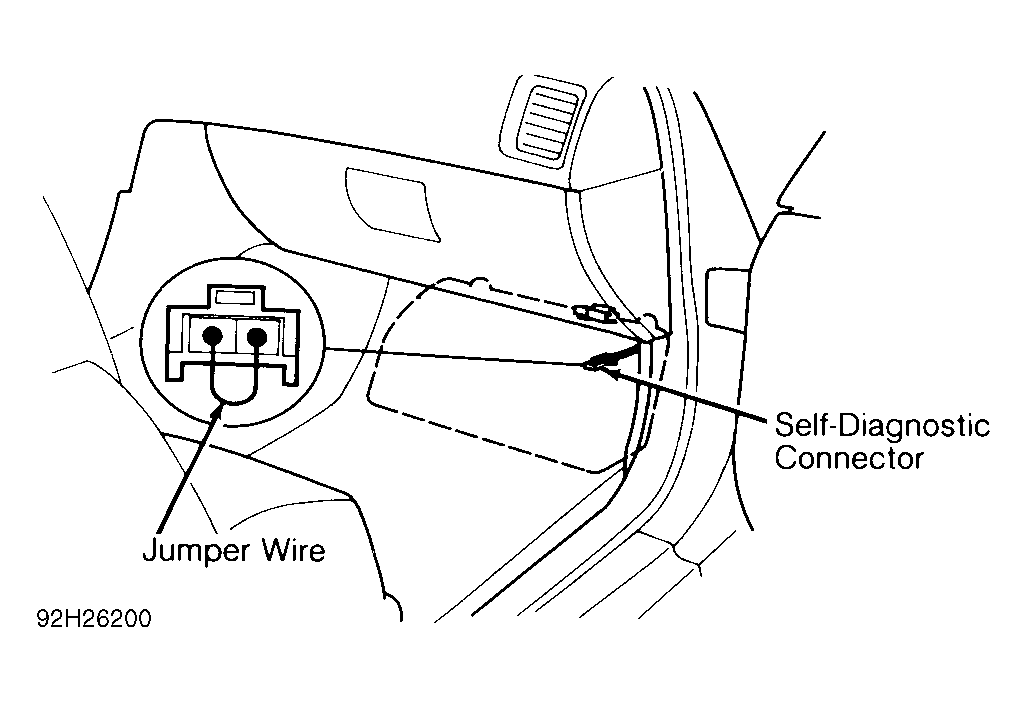CHECK ENGINE light may come on indicating a hard or intermittent failure. Locate diagnostic connector behind glove box. See Fig 1 . Connect diagnostic connector terminals with jumper wire. Turn ignition on. Observe CHECK ENGINE light. Light indicates a system failure code by number of blinks.