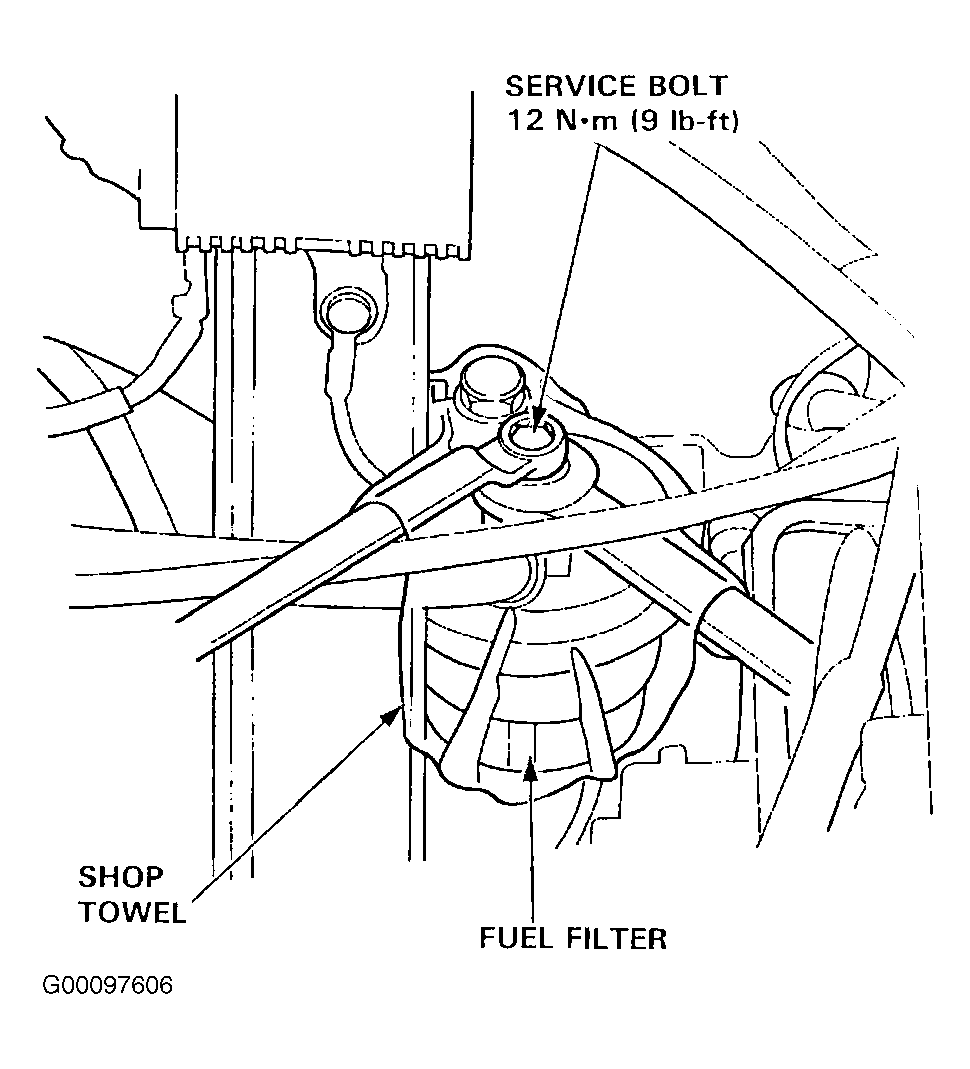 Disconnect the negative battery cable. Remove fuel filler cap. Place a rag or shop towel over service bolt. Loosen 6 mm service bolt one complete turn while holding the banjo bolt. See Fig 1 . Always use new washers on both sides of banjo bolt.