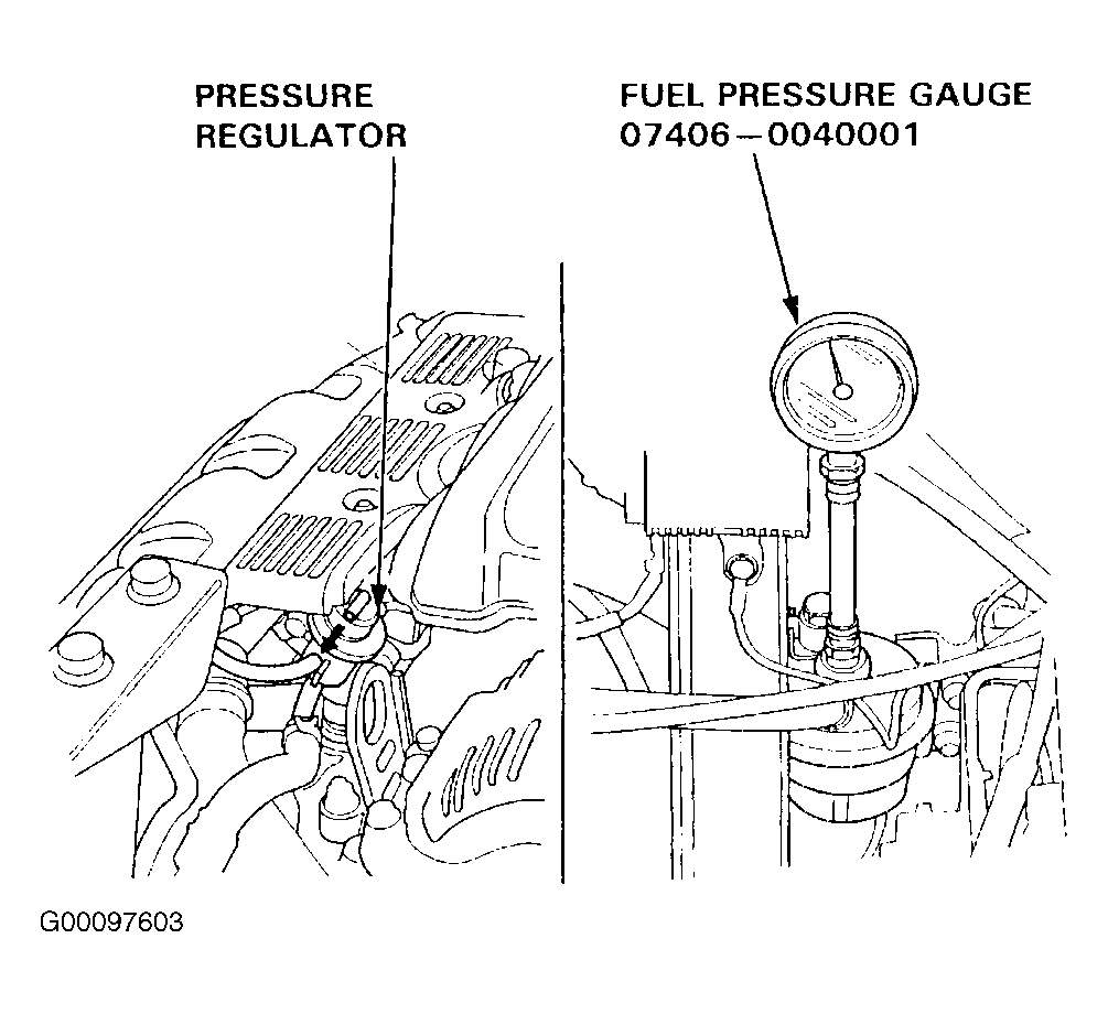 - Start the engine, measure the fuel pressure with the engine idling and vacuum hose of the pressure regulator disconnected and pinched. If the engine will not start, turn the ignition switch to ON for two seconds, turn the ignition to OFF, then back to ON again and check the fuel pressure.