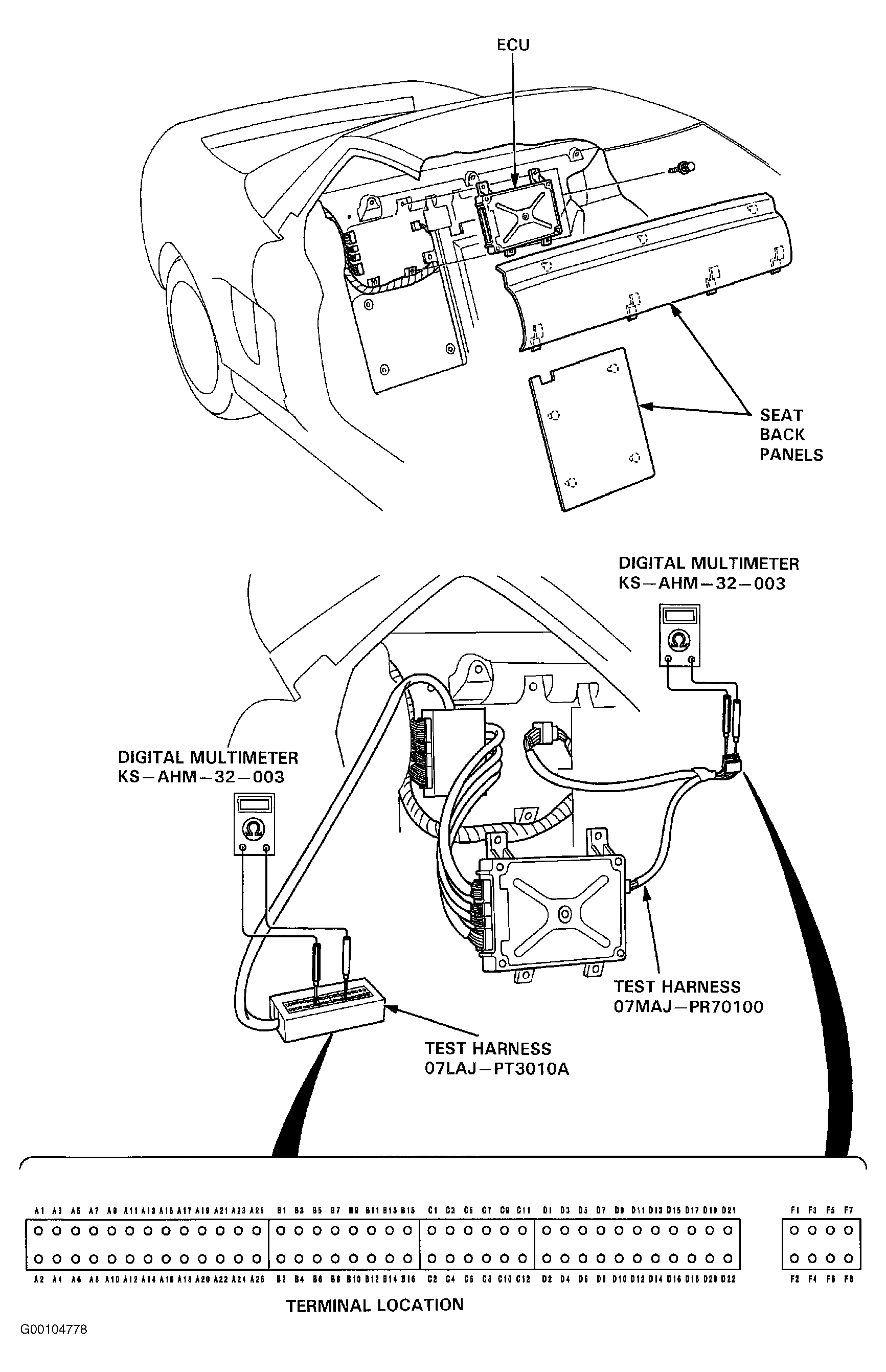 CAUTION: Perform all resistance and voltage tests with a Digital Volt-Ohmmeter (DVOM) with minimum 10-megohm impedance, unless stated otherwise in test procedures. If the inspection for a particular failure code requires the test harness, remove the seat back panels. Unbolt the ECU bracket and connect the test harness. Check the system according to the procedure described for the appropriate code. For test harness connection, see Figure .