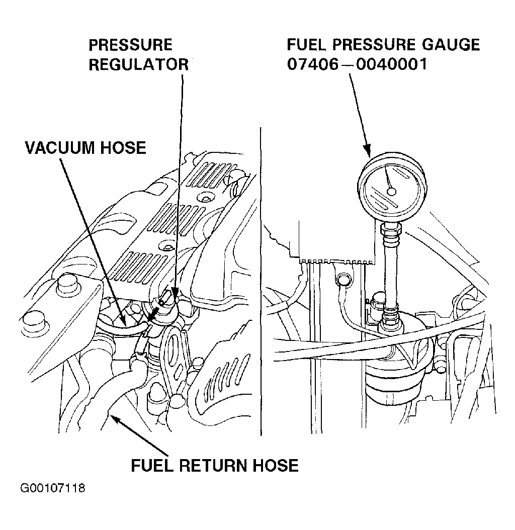 - Ensure fuel pressure rises when the vacuum hose from the regulator is disconnected again. If the fuel pressure did not rise, check to see if it rises with the fuel return hose lightly pinched. If the fuel pressure still does not rise, replace the pressure regulator.