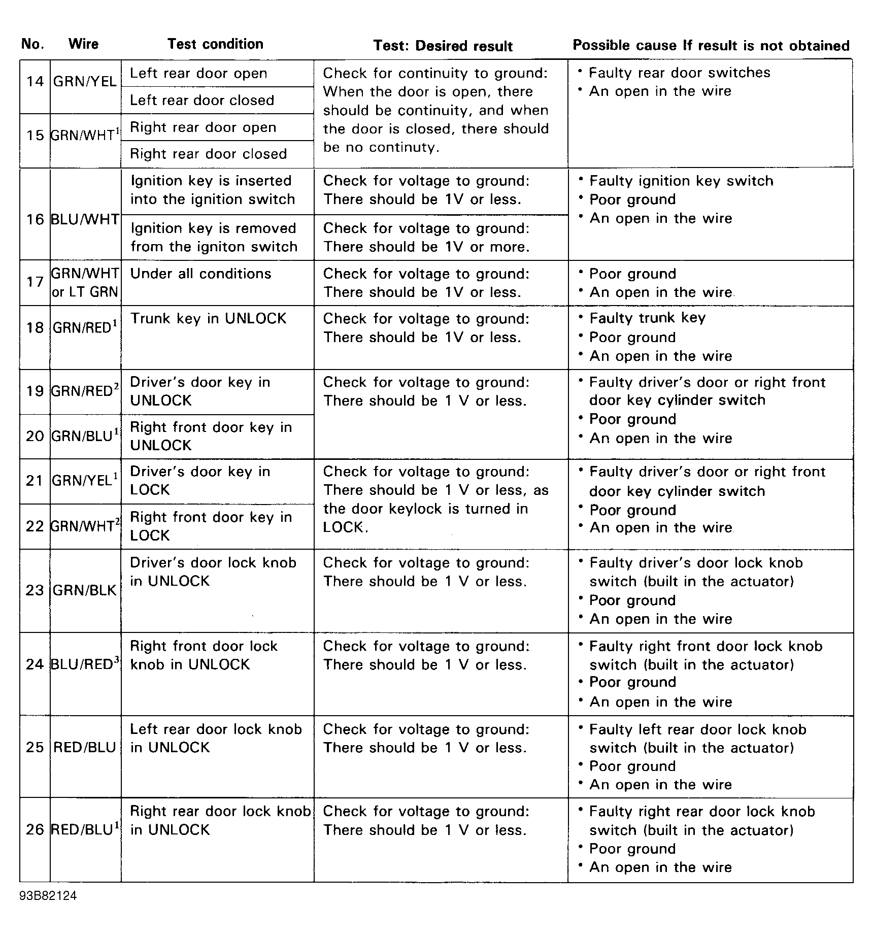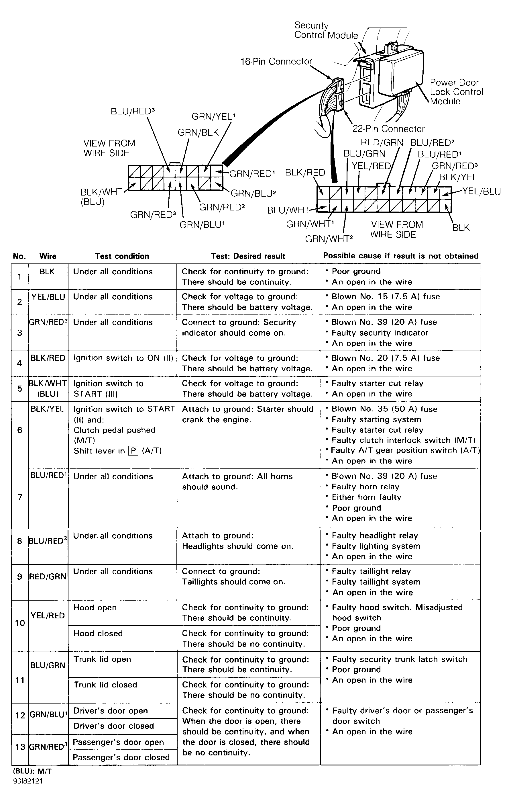 Remove driver's side instrument panel lower cover. Disconnect security system control module 16-pin and 22-pin connectors. Inspect connectors to ensure terminals are making good contact. If terminals are bent, loose or corroded, repair as necessary and recheck system. If terminals are okay, use a Digital Volt/Ohmmeter to perform SECURITY CONTROL MODULE INPUT TEST . See Fig 1 -Fig 4 . If input test is okay, replace control module.