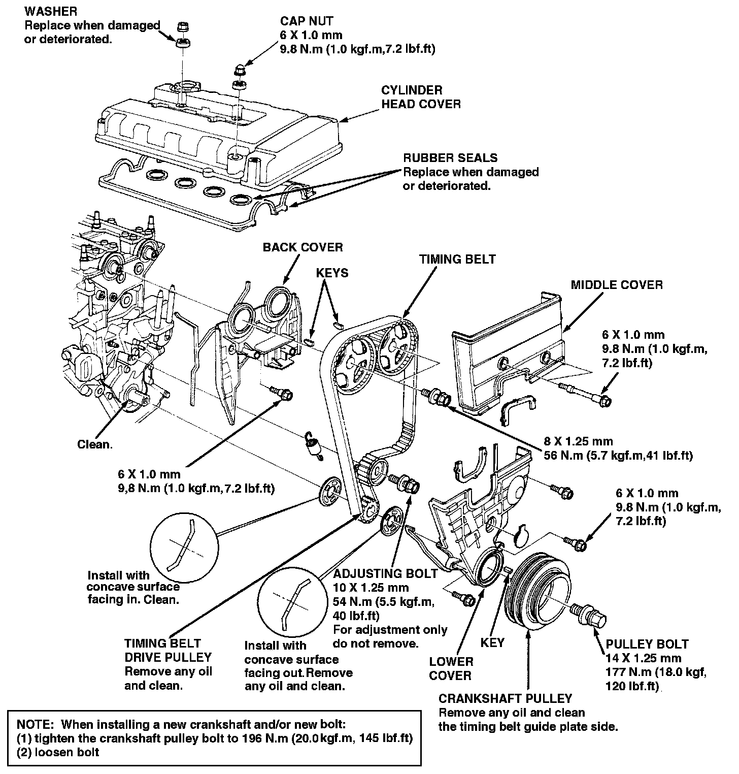 (1) tighten the crankshaft pulley bolt to 196 N.m (20.0 kg.m, 145 lb.ft)