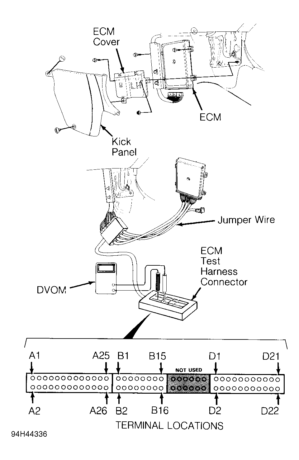 3. Check for continuity between test terminal D6 and Blue/Black wire terminal. If continuity is not present, repair open in Blue/Black wire between VTEC pressure switch connector and ECM. If continuity is present, check for continuity between test terminal D6 and body ground. If continuity is present, repair short in Blue/Black wire between VTEC presure switch connector and ECM. See Figure. If continuity is not present, go to step 4).