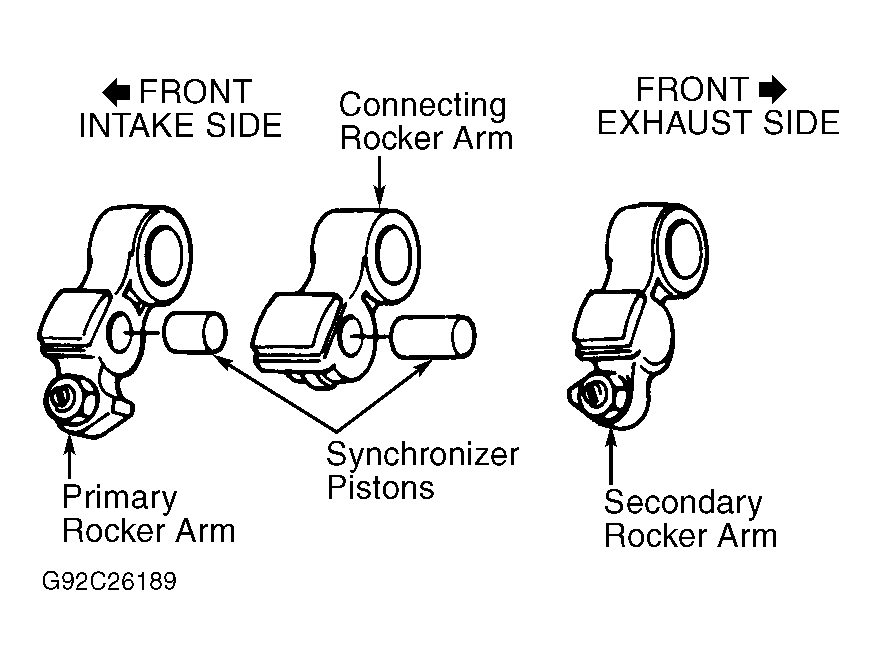 At low speed, primary and secondary rocker arms control intake valve timing, lift and duration. Connecting rocker arm remains disengaged and has no effect on engine operation. At high RPM with heavy engine load, PCM activates spool valve and oil pressure is applied to synchronizer pistons located in primary and secondary rocker arms. This locks primary, connecting and secondary rocker arms together so they are driven as a single unit by high lift cam lobe.