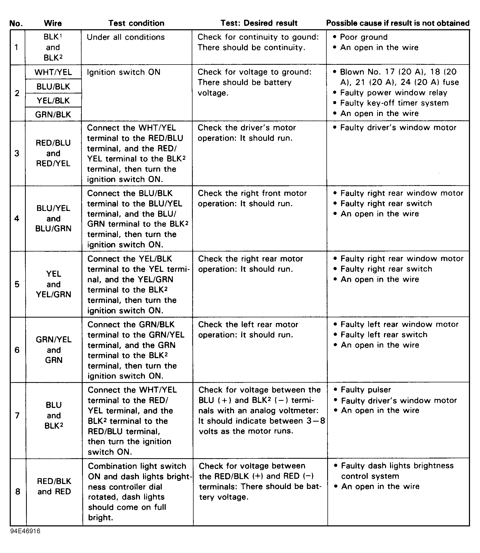 Turn ignition off. Remove driver's door panel. Unplug connectors from master switch. Using a DVOM, perform switch input tests in Fig 1 or Fig 2 . If all input test results are okay, inspect connector and terminals for damage and proper fit. If connector is okay and power windows still malfunction, replace master switch.