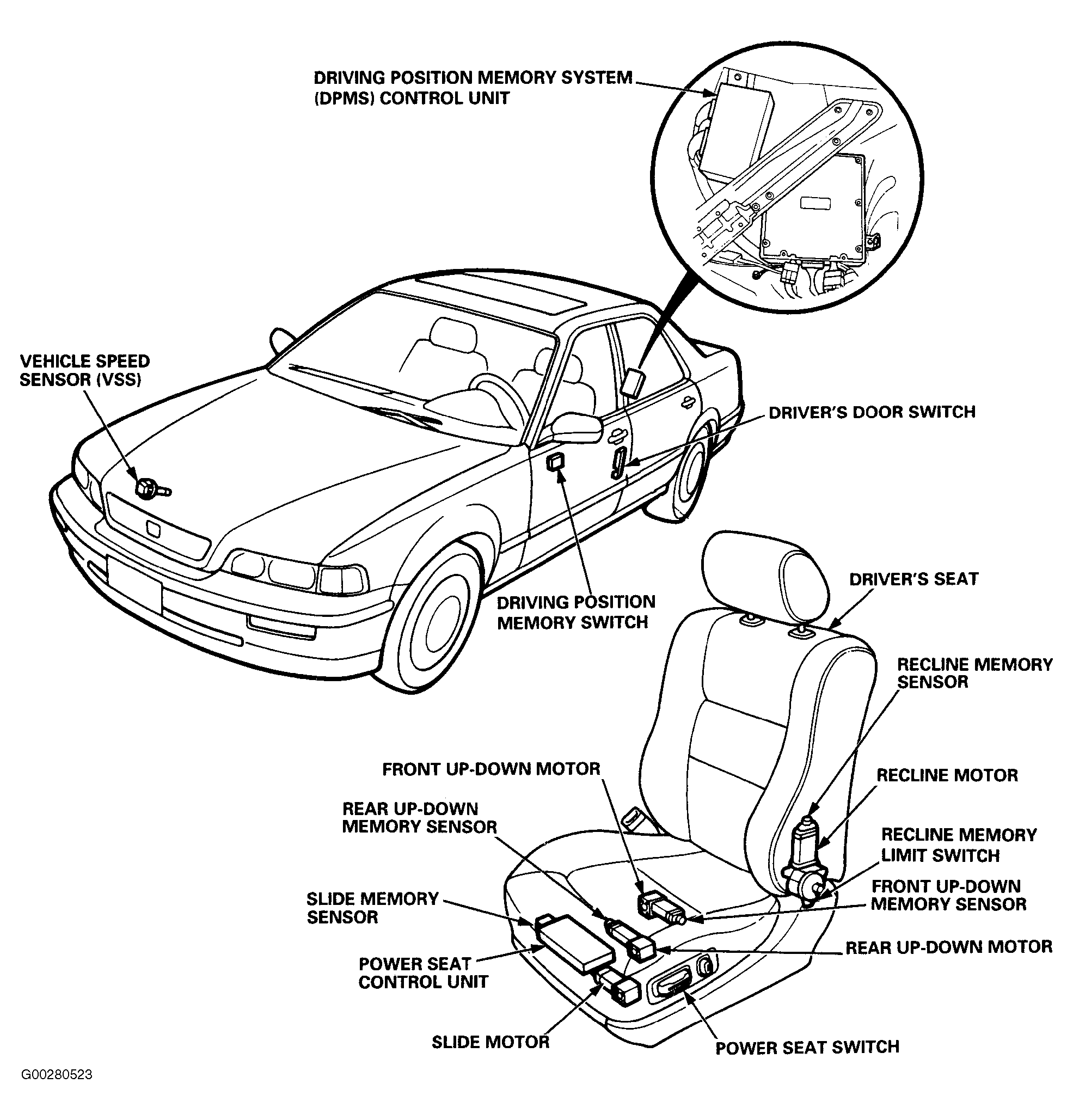 Driving Position Memory System (DPMS) control unit is located behind rear seat, in trunk. See Figure . Disconnect connectors and remove components as needed to remove DPMS control unit. To install, reverse removal procedure.