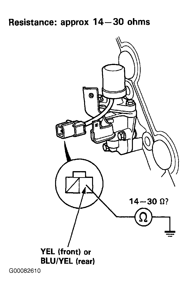 - Measure resistance between the YEL (front) or BLU/YEL (rear) terminal and body ground. See Fig 1