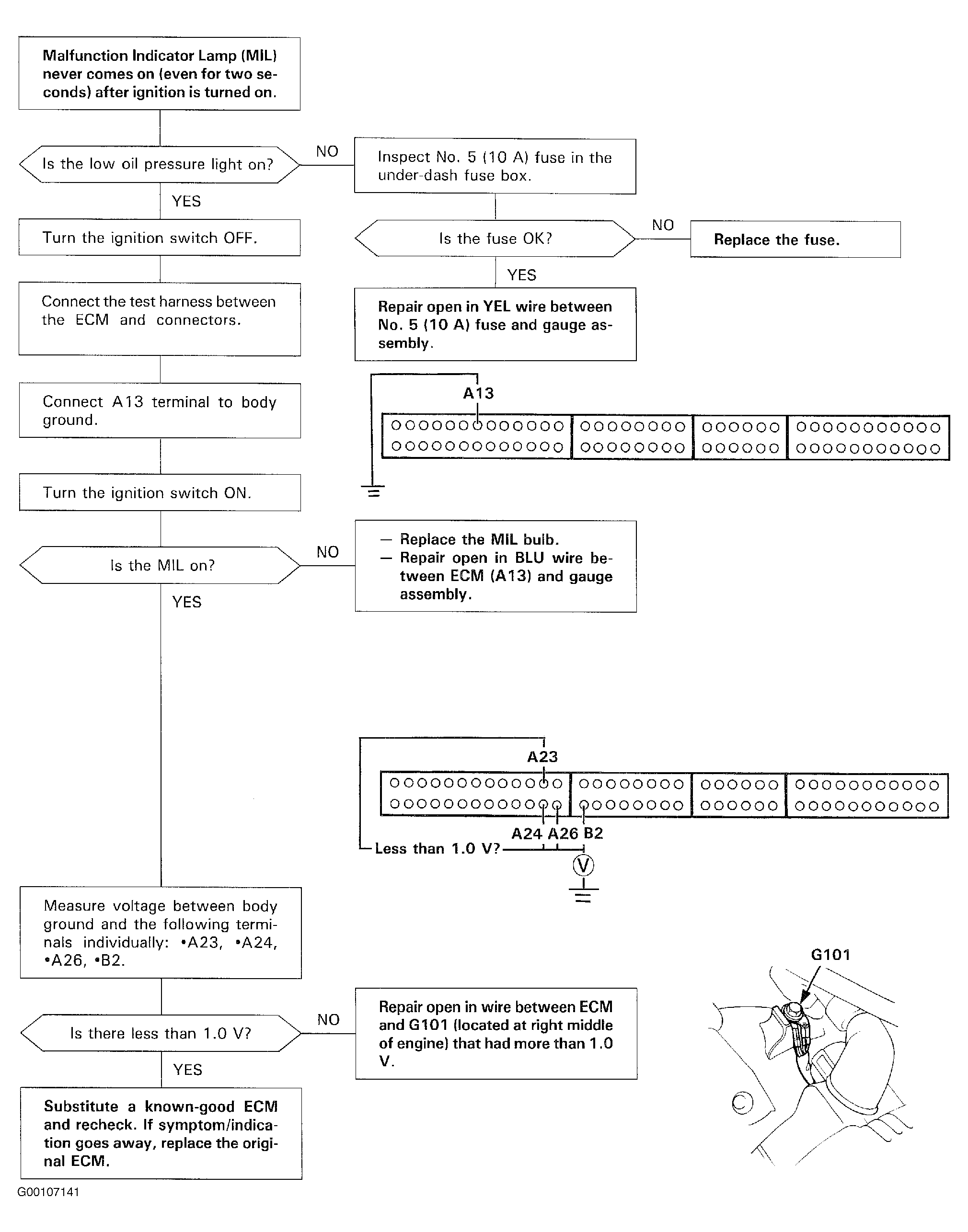 Fig 1: MIL Never Comes On After Ignition Is Turned On Diagnostic Flowchart