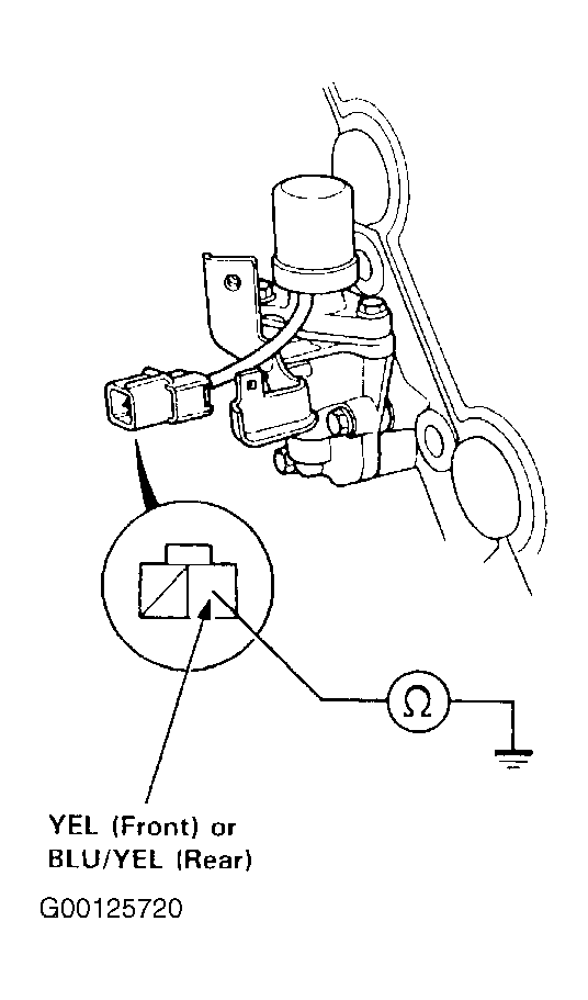 2. Measure resistance between the Yellow (front cylinder head) or Blue/Yellow (rear cylinder head) terminal and body ground. Resistance should be approximately 14-30 ohms. See Fig 1 .