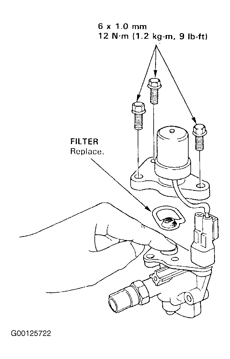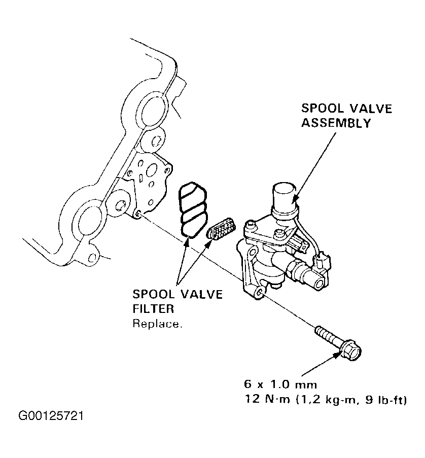 3. If the resistance is within specifications, remove the spool valve assembly from the cylinder head and check the spool valve filter for clogging. If there is clogging, replace the engine oil filter and engine oil. See Fig 2 .