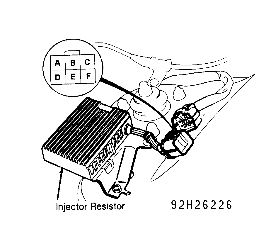 5. Measure resistance between terminal "A" and all other terminals. See Fig 1 . If resistance is not 5-7 ohms, replace injector resistor. If resistance is 5-7 ohms, repair open in Red/Black wire between 2-pin connector and injector resistor.