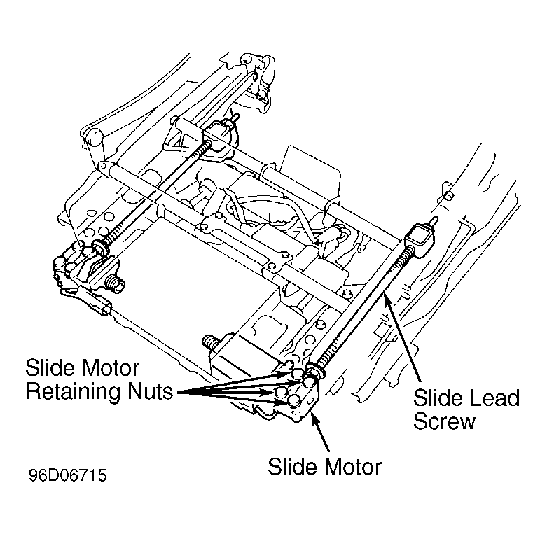 Remove seat. Remove seat cushion. Remove slide joint cable. See Fig 1 . Disconnect wiring connectors. Remove slide motor retaining nuts and bolts. Remove slide motor. To install, reverse removal procedure. When installing slide motor, apply grease to slide lead screw.