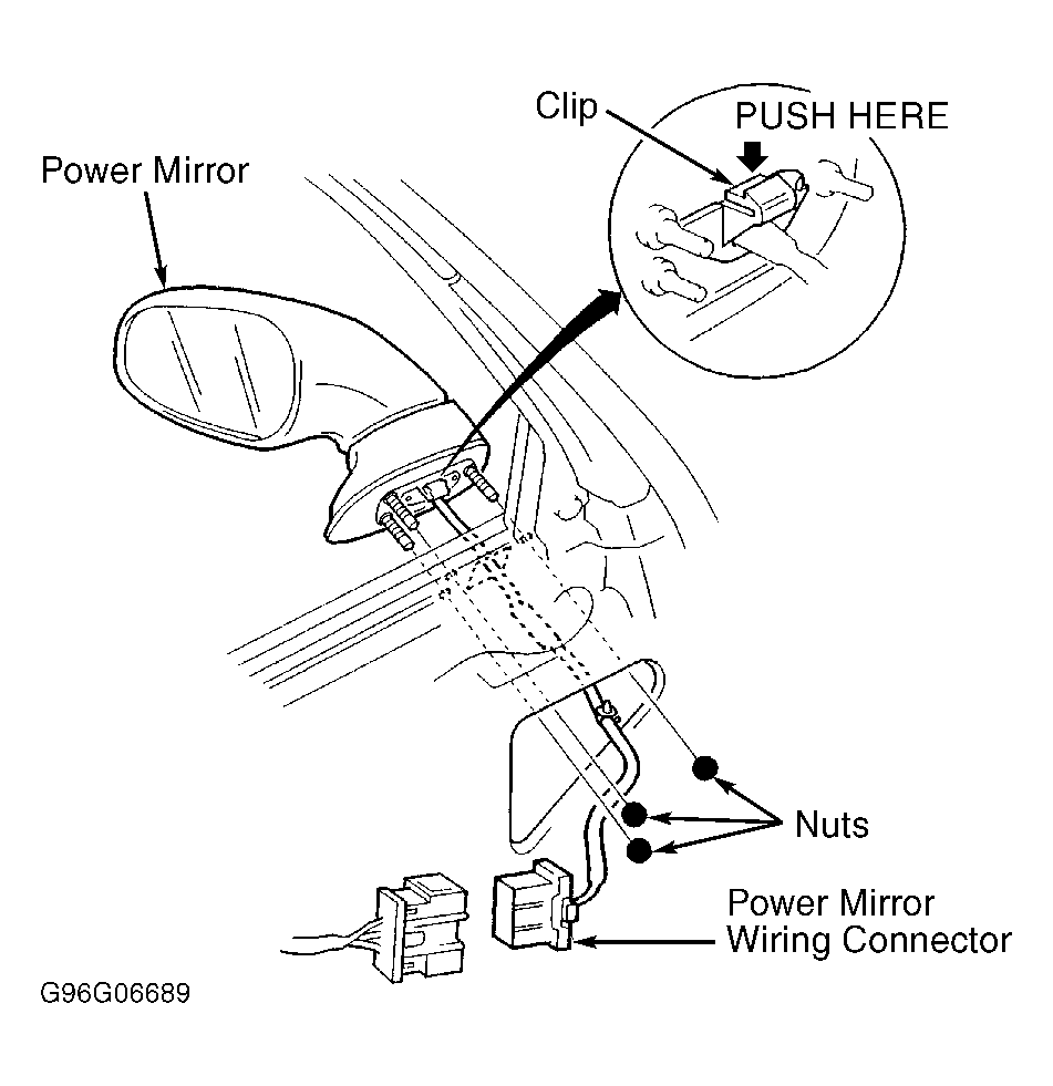 Raise door glass fully. Remove door panel and plastic cover as required. See DOOR PANEL . Disconnect power mirror wiring connector. Remove nuts holding mirror in place and remove mirror. See Fig 1 . To install, reverse removal procedure. Tighten power mirror nuts to 7.2 ft. lbs (9.8 N.m).