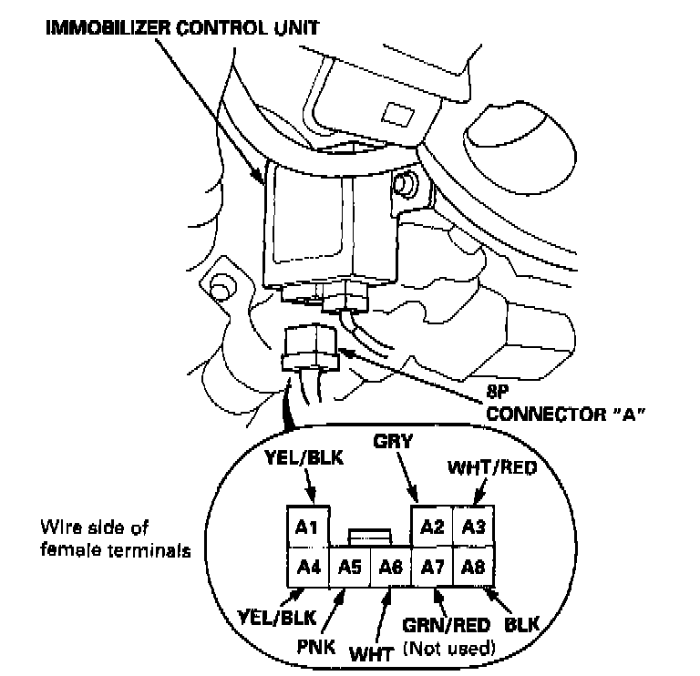 2. Disconnect the 8P connector "A" from the immobilizer control unit.