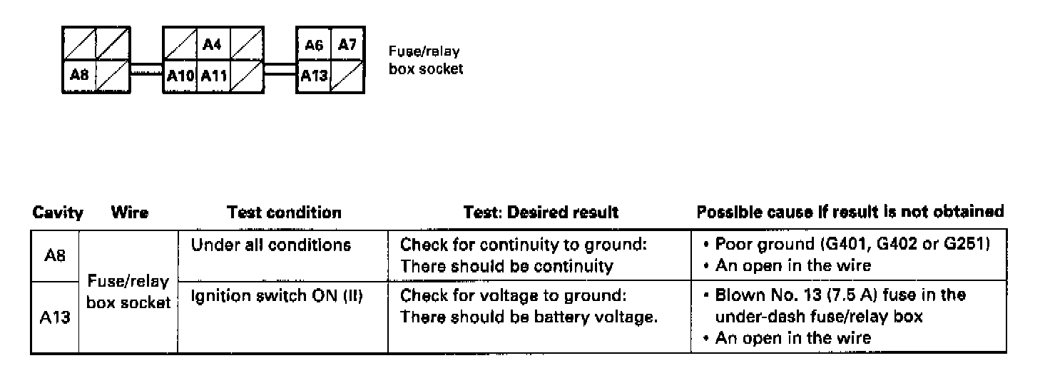 * If the terminals look OK, make the following input tests at the connector and the fuse/relay box socket.