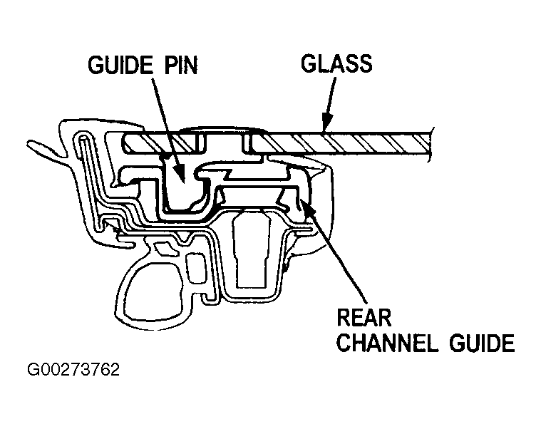 - Make sure the guide pin is installed in the rear channel guide properly. See Figure . Raise the glass. Loosen the glass mounting bolts and regulator mounting bolts. Push the glass rearward.
