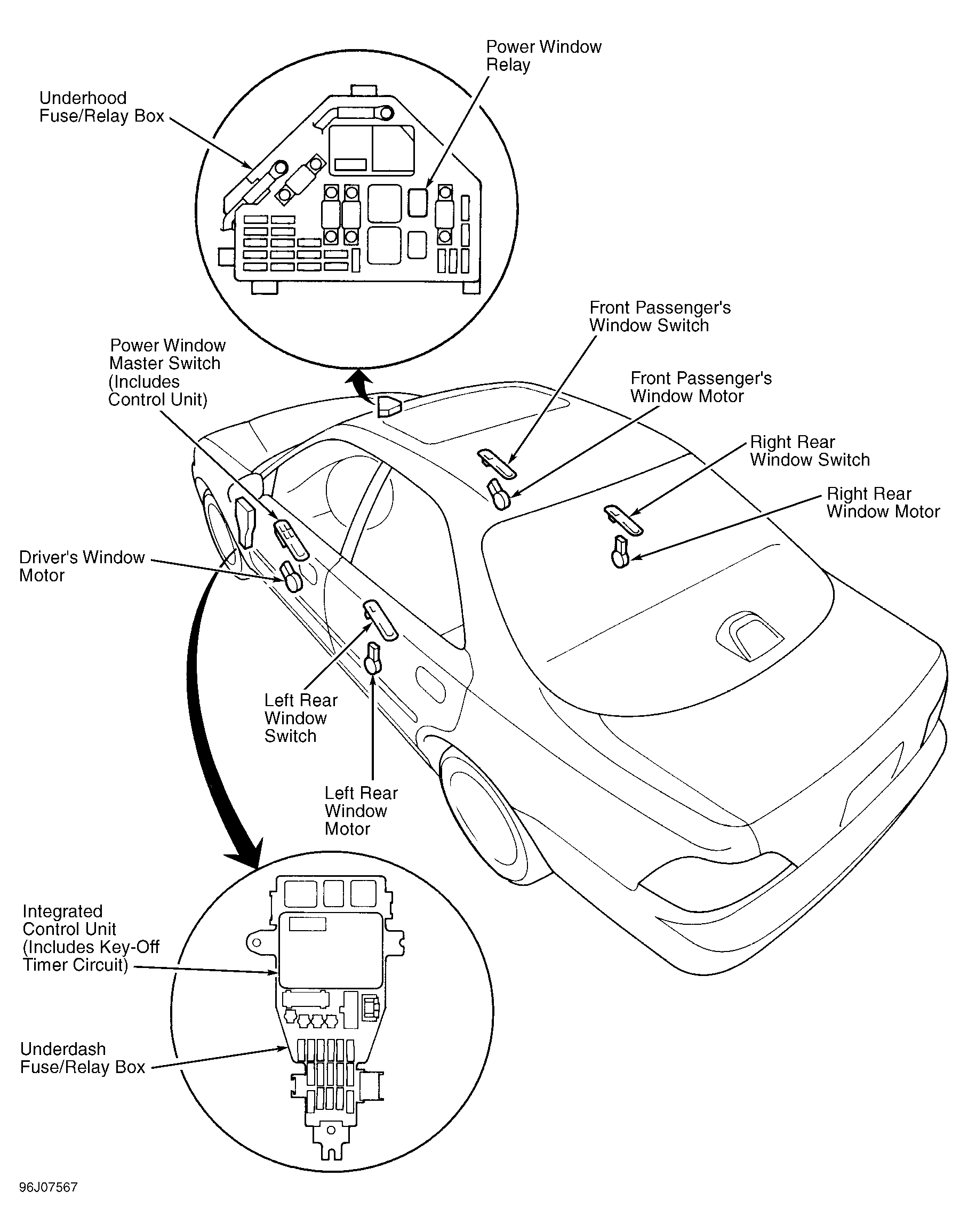 - Connect a fused jumper wire between fuse/relay box 14-pin "B" socket terminal B12 and integrated control unit Green 16-pin connector terminal A15 (Red wire). Check operation of all windows. If all windows operate, replace integrated control unit. If windows do not operate, check power window relay. See POWER WINDOW RELAY TEST. If power window relay is okay, check for a poor ground. See WIRING DIAGRAMS. Check for an open in Red wire between integrated control unit and fuse/relay box located in engine compartment.